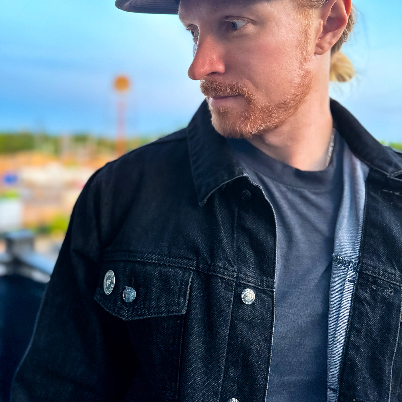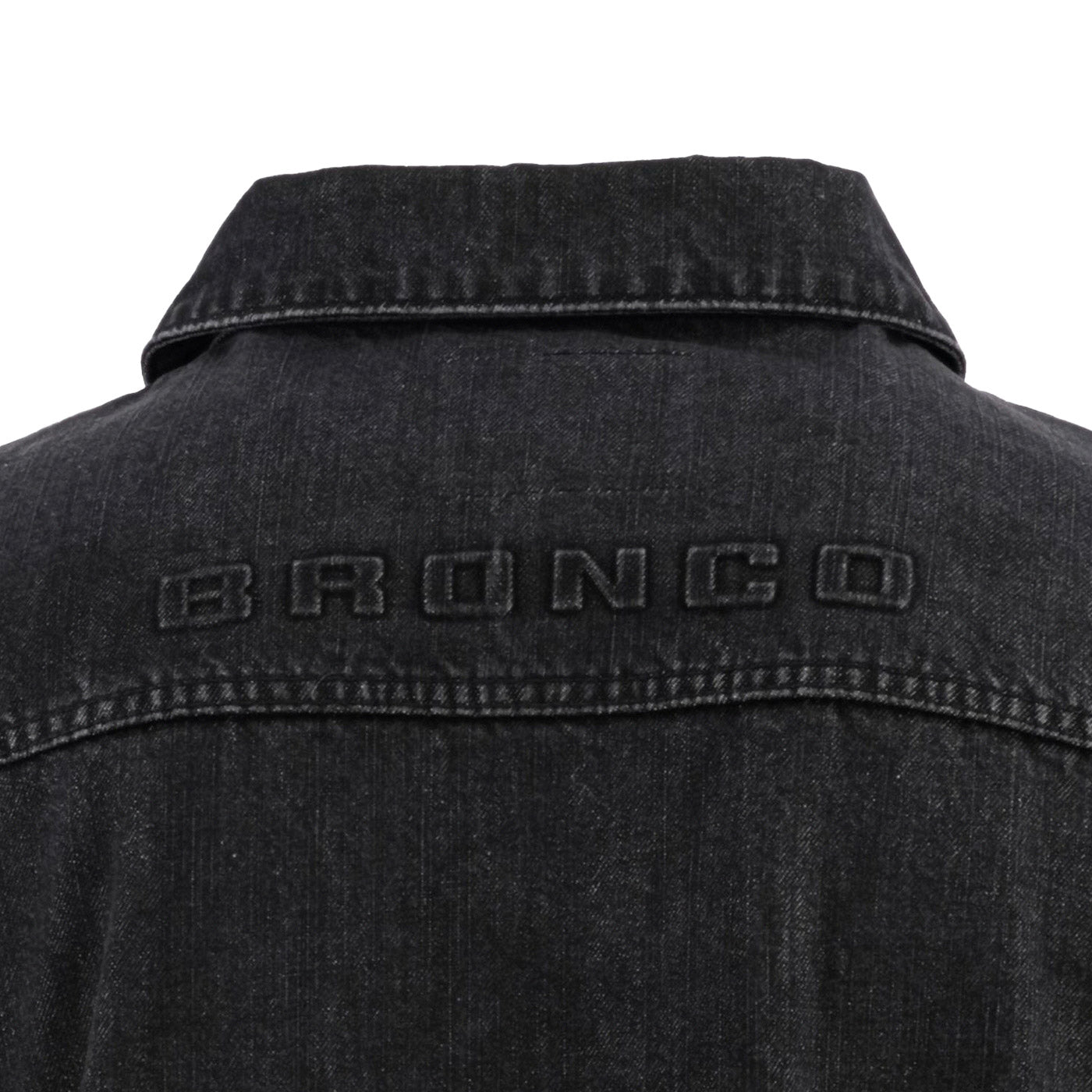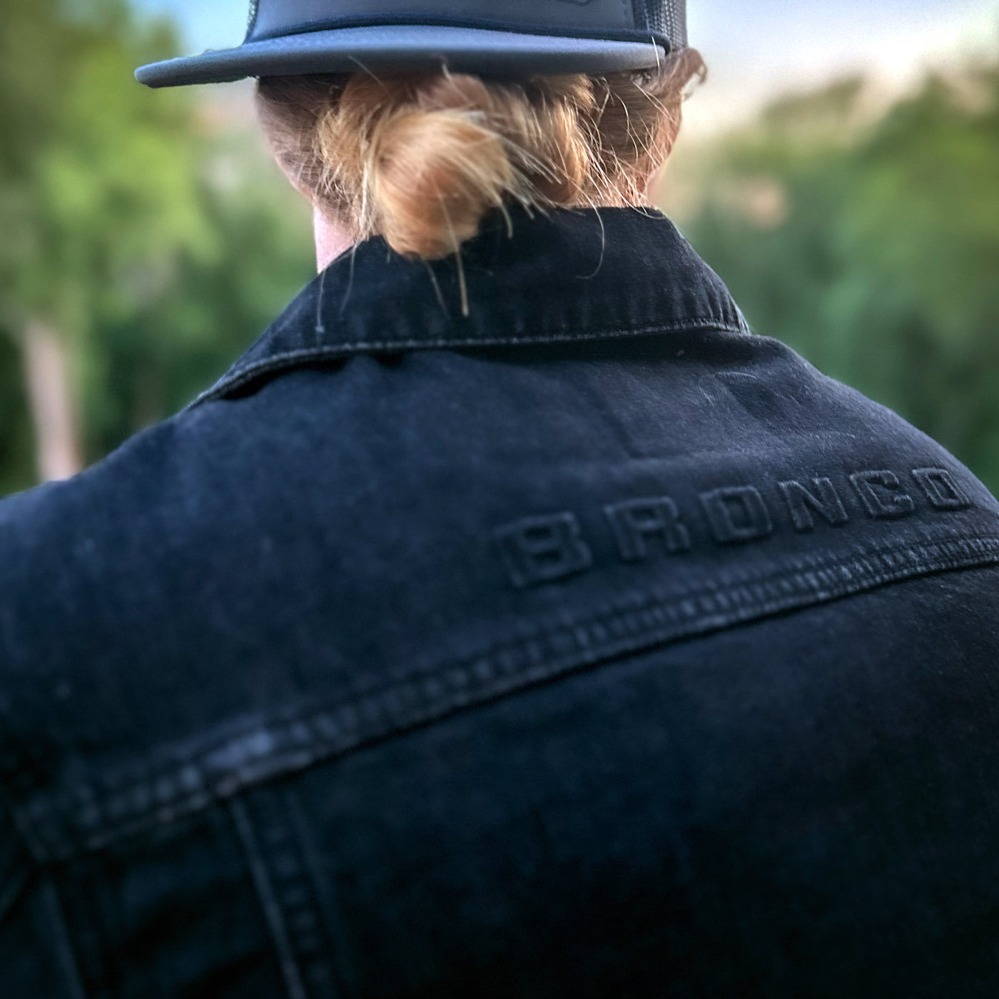 This is a twist to the classic men's denim jacket. It is in black vintage wash denim with modern Bronco embellishments. You will see across the back yoke an embossed raised Bronco logo. On the metal buttons, you will see the embossed Bucking Bronco logo. The jacket has two front pockets with buttons, two side pockets, and two inside hidden pockets.
