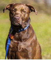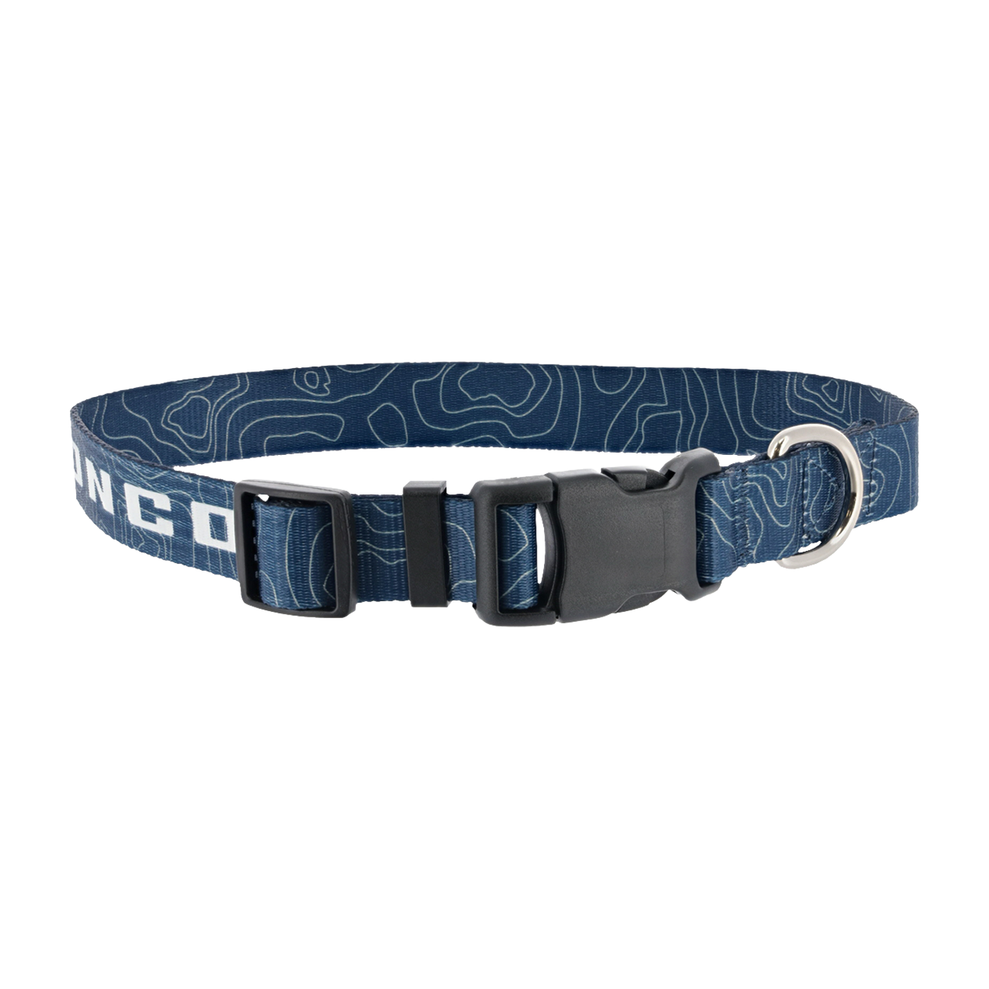 The collar is a darker navy color with grey lines that are actual topographical grid indicators. The Bronco logo is embroidered and centered on the collar. It is adjustable for a secure fit. Two different sizes are offered, which will fit small, medium, and large breeds. The collar has a heavy plastic closure and a stainless-steel hoop for securing the leash, too.