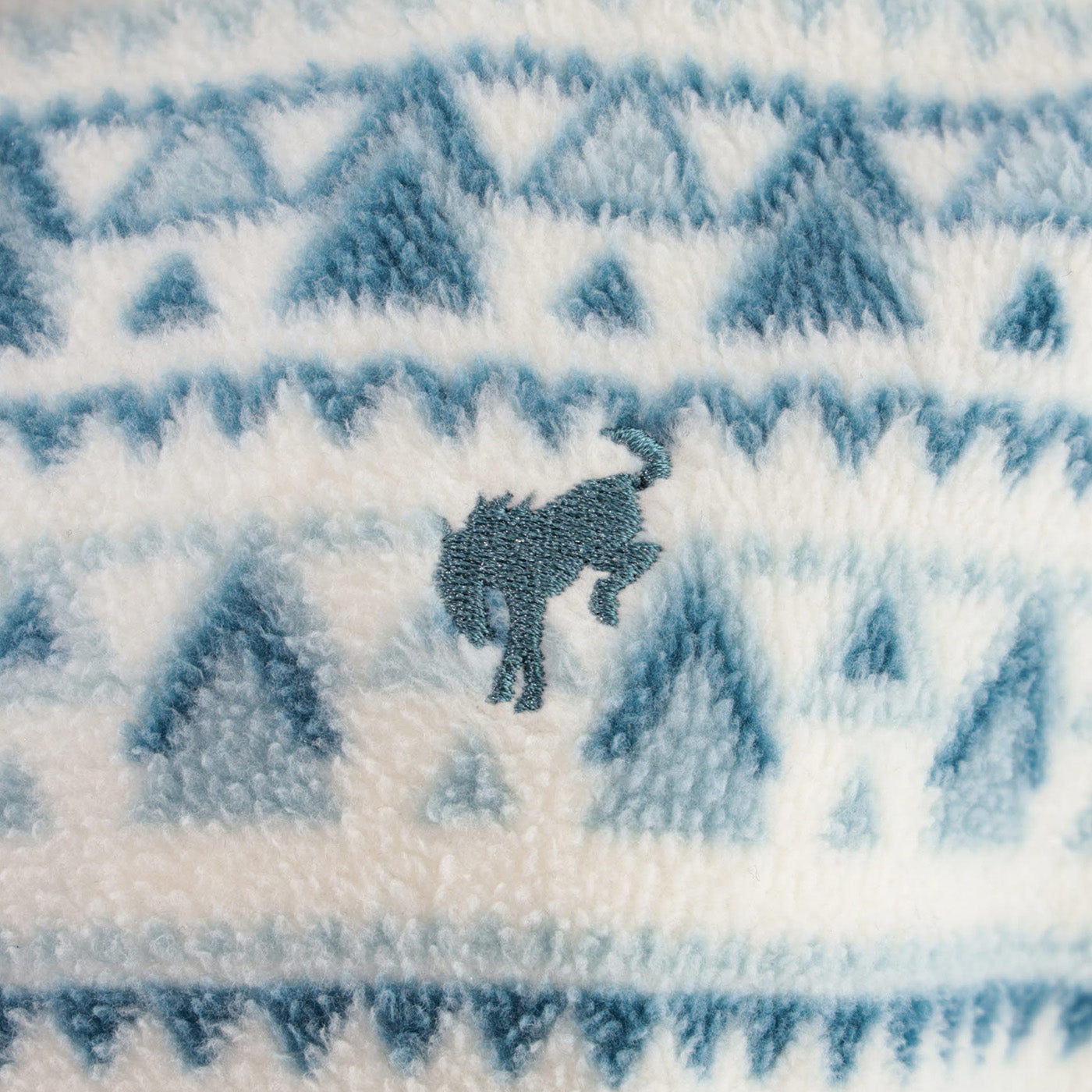 The main body color is white with geometric shapes in hints of blue, teal, and green. There is a bucking Bronco embroidery on the left chest. Along the hem, wrist cuffs, zippered neckline, and collar is contrasting piping for a softer texture. There are two pockets on either side of the garment.
