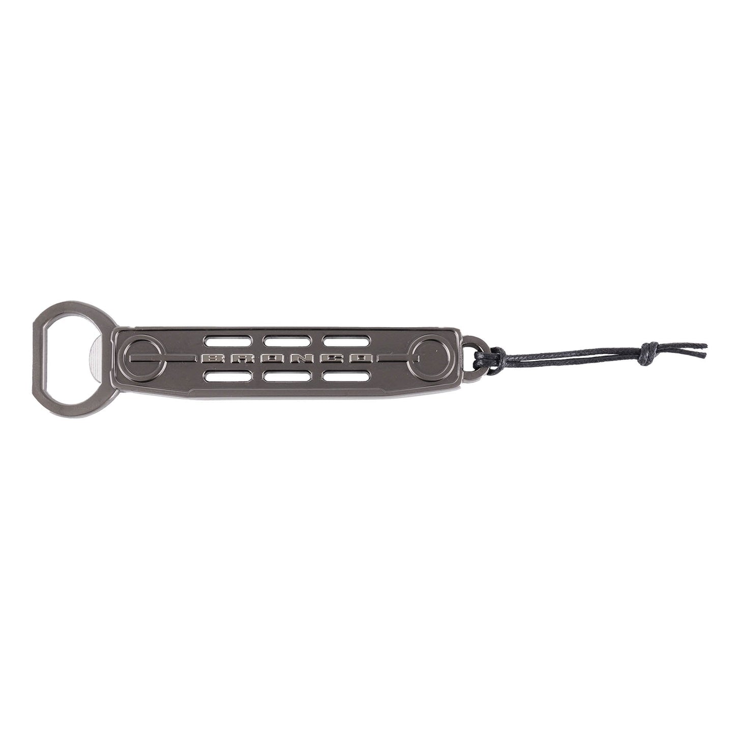 This heavy-duty matte black metal bottle opener is officially licensed Ford merchandise, featuring a unique design modeled after the grill of the new Bronco. It is equipped with a strong leather strap for opening bottles with ease.