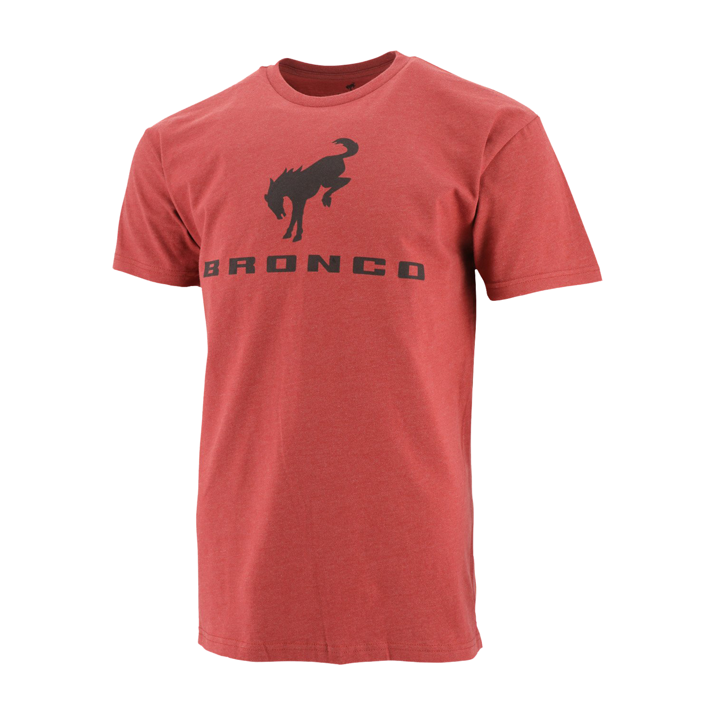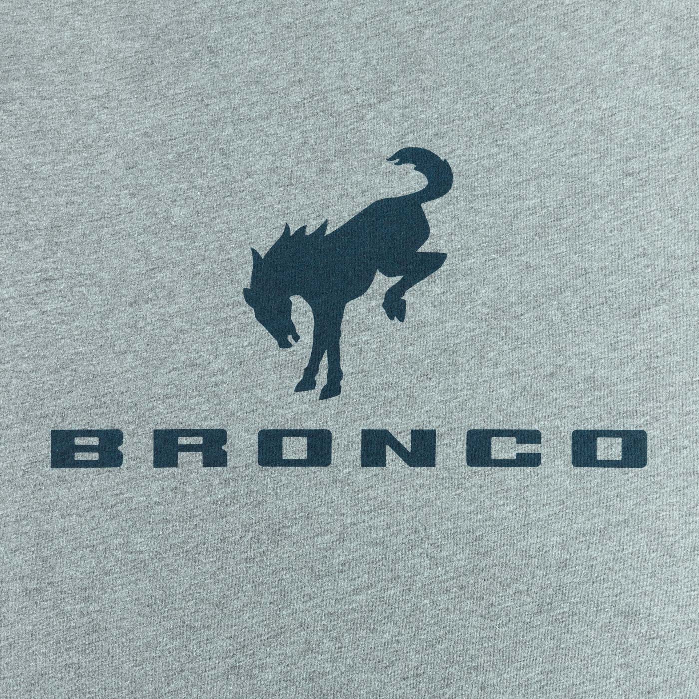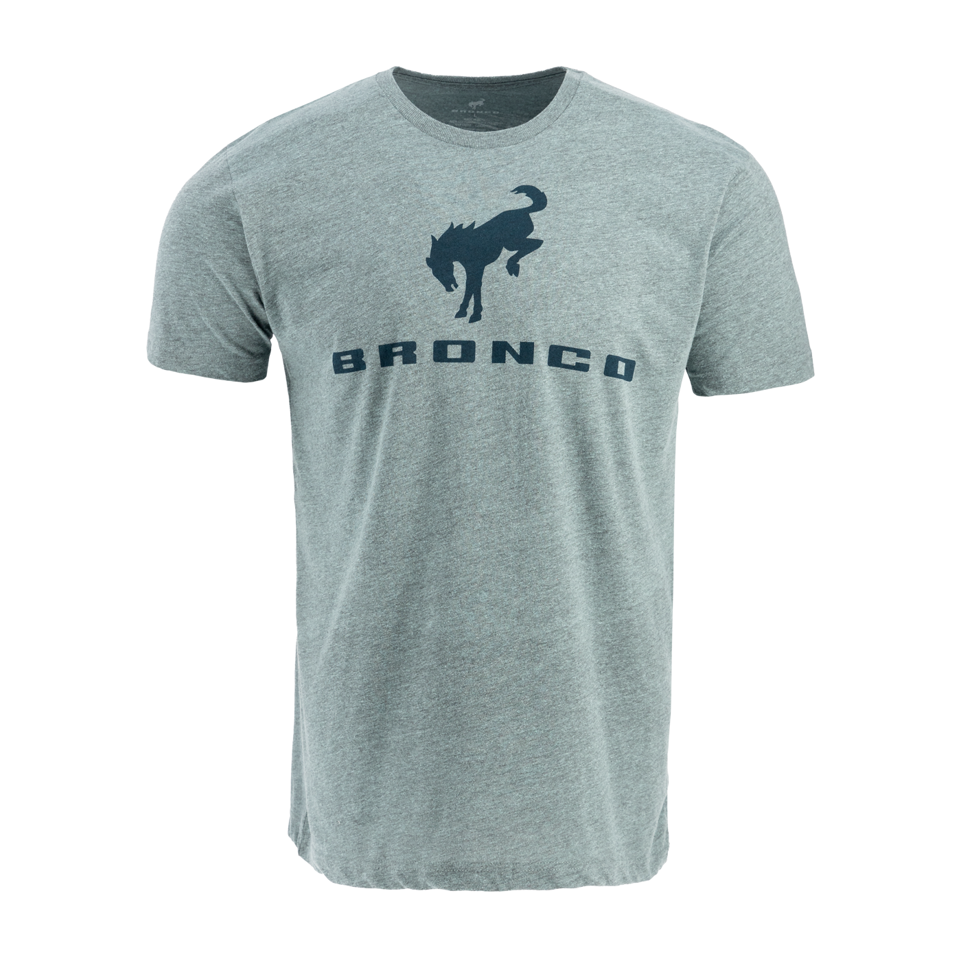 This Ford Bronco Men's Logo short-sleeved t-shirt features a classic relaxed fit and is designed for daily wear. The heathered blue tee has a printed navy Bronco logo on the front and is complete with a ribbed collar and tag-less neck label for enhanced comfort. 60% combed ring-spun cotton and 40% polyester construction.