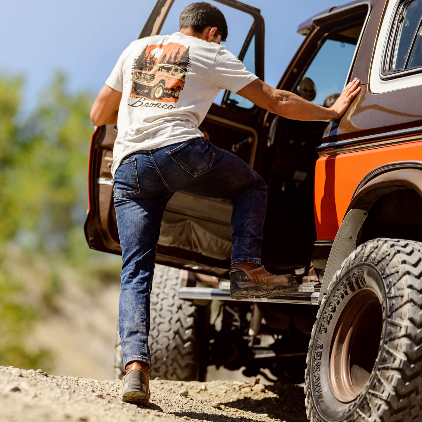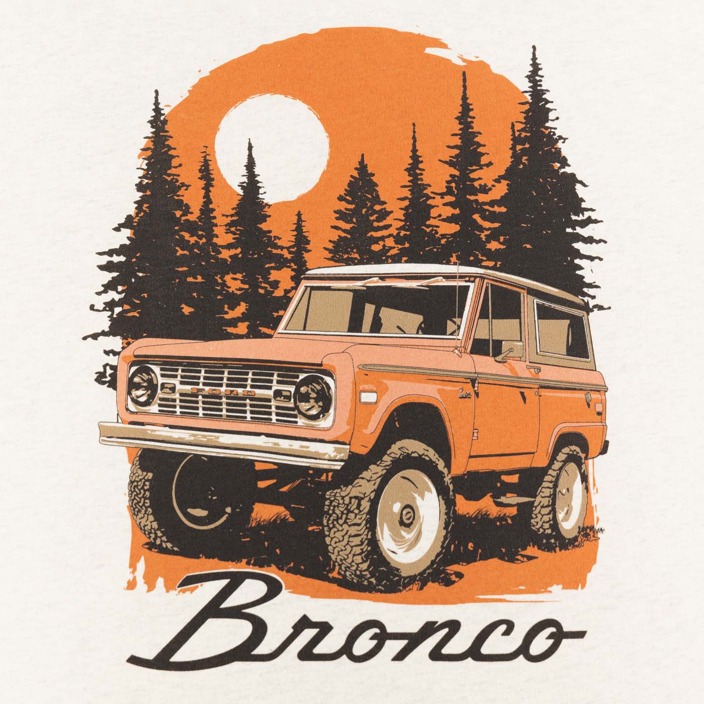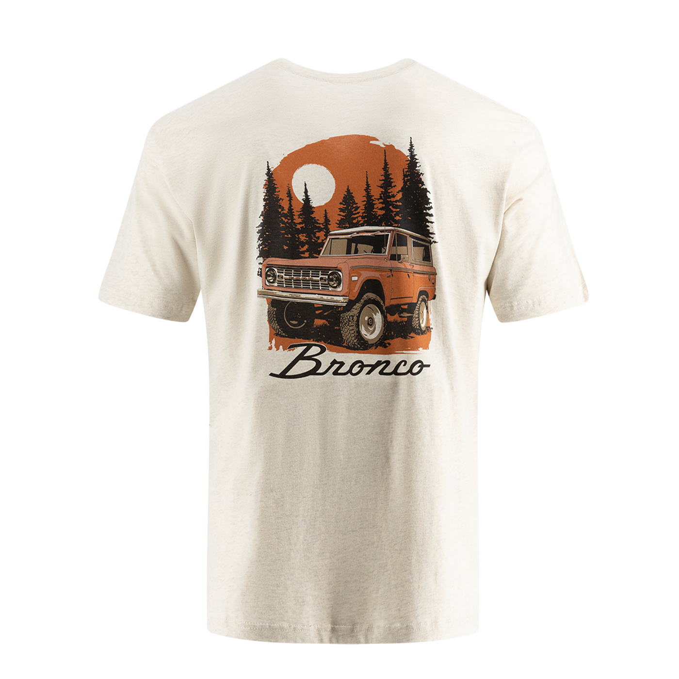 Head out on an adventure with this Ford Bronco Mens vintage Graphic T-Shirt! Showcasing a cool wilderness scene with pine trees and a bright orange vintage Bronco on the back, plus the classic Bronco script on the front chest. Made from comfy 100% cotton, it features a ribbed collar, sturdy double-stitched sleeves and hem, and side seams for a great fit. Just turn it inside out and wash cold with like colors then tumble dry low. Keep your iron away from the graphic and skip the dry cleaning to keep it looking fresh.