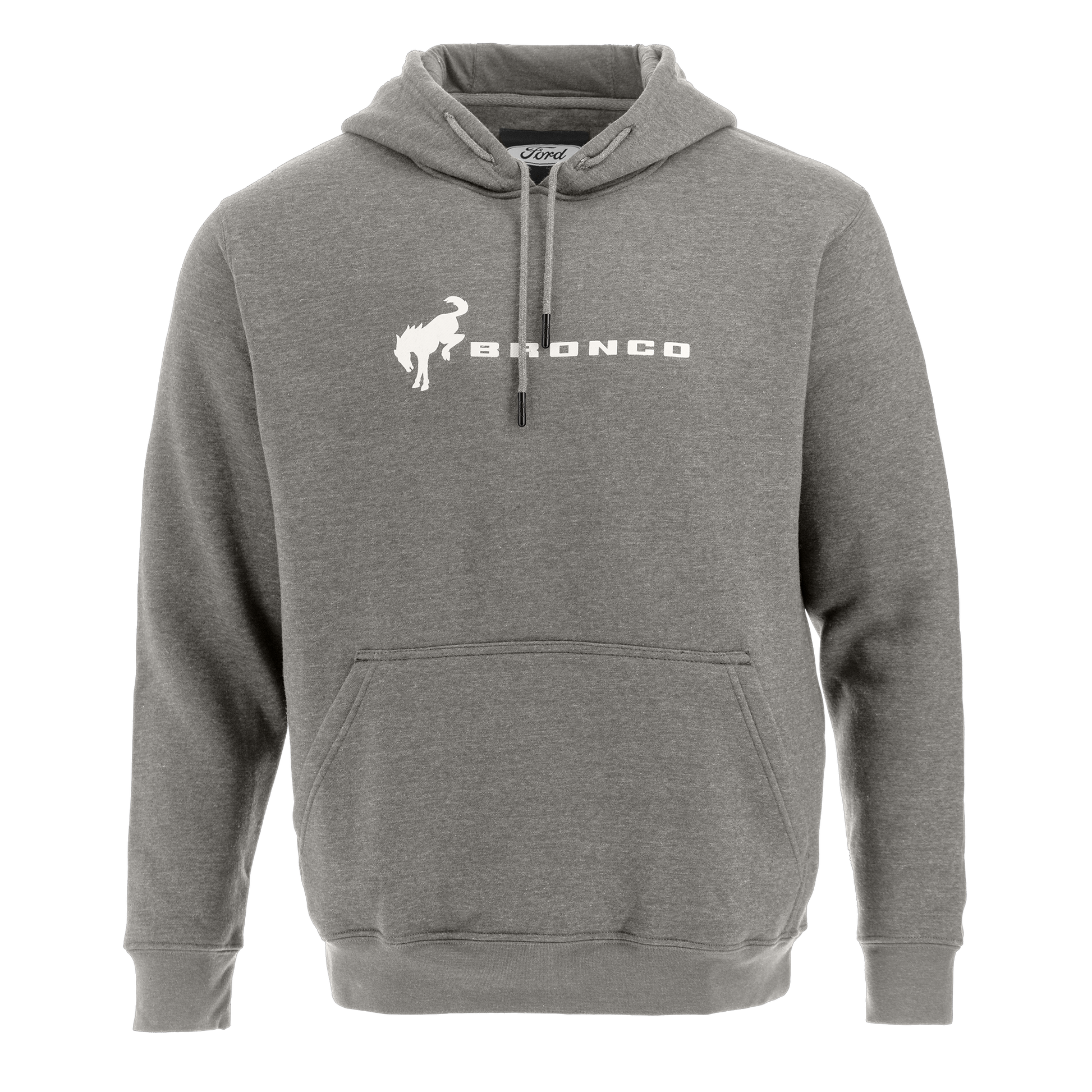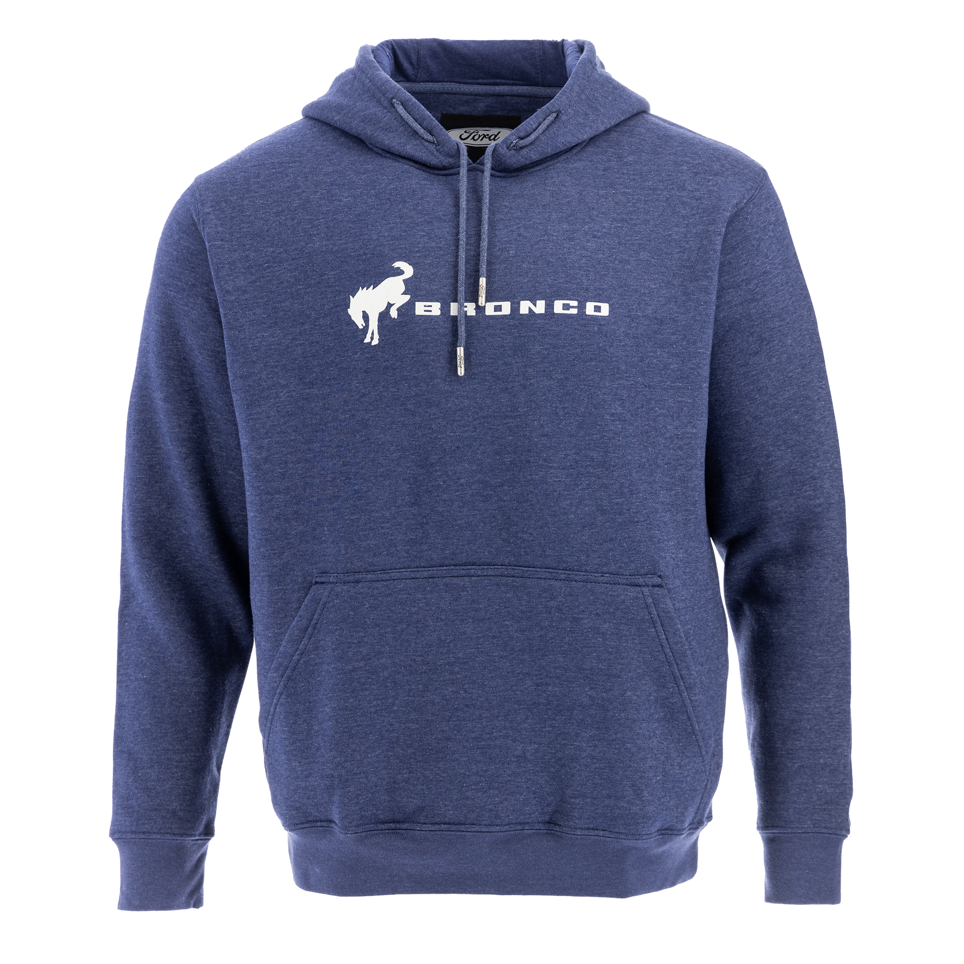 Featuring a cozy fleece lining, ribbed cuffs and hem, and a secure kangaroo pocket with an elastic mesh liner for your phone, this hoodie is perfect for your next adventure. The bold Ford Bronco graphic adds a modern touch, while the classic fit and heather navy or grey colors make it easy to wear anywhere. Embrace comfort and rugged style on every casual outing.