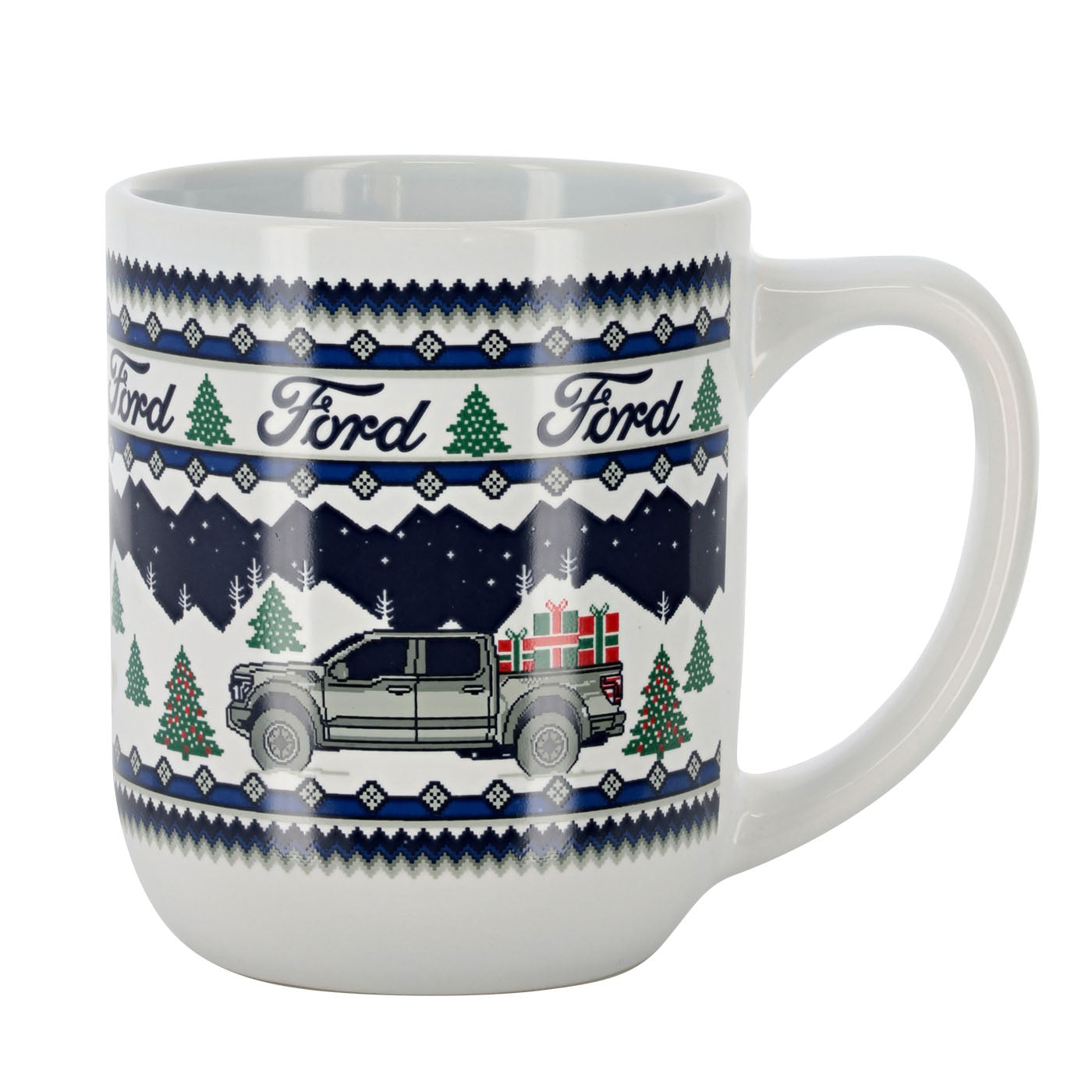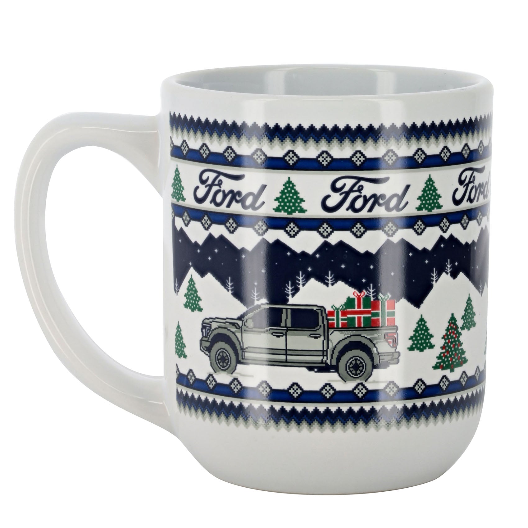 Perfect for a hot drink at any time of day, the Ford Holiday mug brings much-needed holiday cheer to your day. It features a peaceful, merry snowscape centered on an F-150 with colorful presents. This mug is an excellent gift for the Ford person in your life as a holiday companion that can keep pace with them throughout the day, from coffee to cocoa.