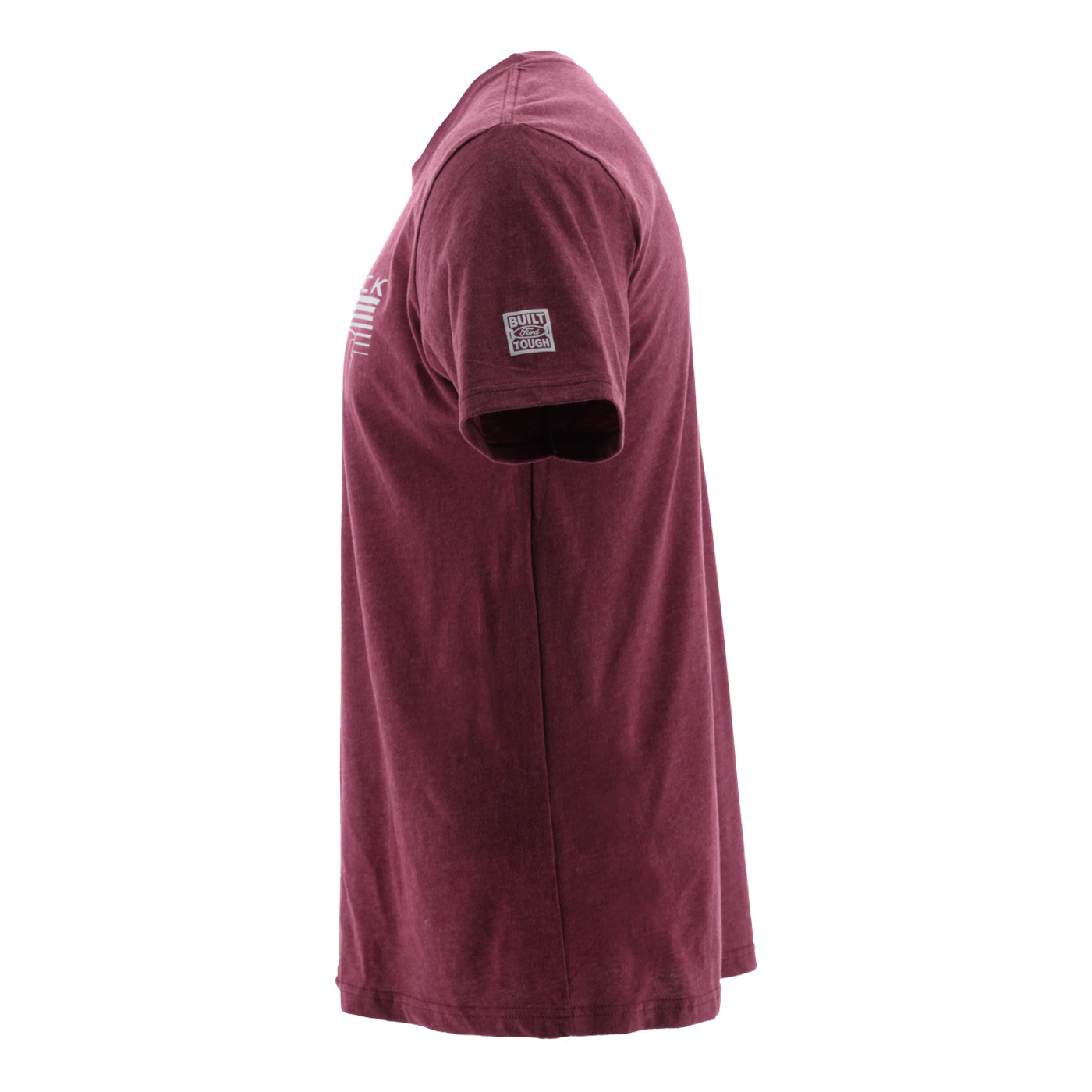 This side-seamed constructed men's short-sleeve red t-shirt, crafted from the Ford Maverick series, is made of a blend of 60% polyester and 40% combed ring-spun cotton. It features a striped Maverick logo and a silhouette chest print, alongside the 'Built Ford Tough' logo printed on the wearer's left sleeve.