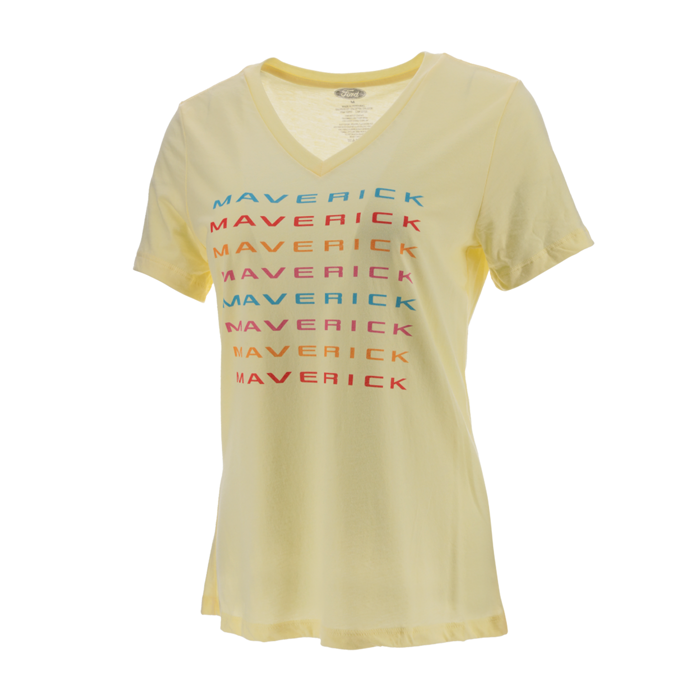 This lightweight women's V-neck short-sleeve yellow t-shirt from Ford Maverick features a V-neckline and a slightly curved design for a flattering fit. The tag less label ensures optimal comfort, and the Maverick logo is displayed in a stunning stacked digital print.