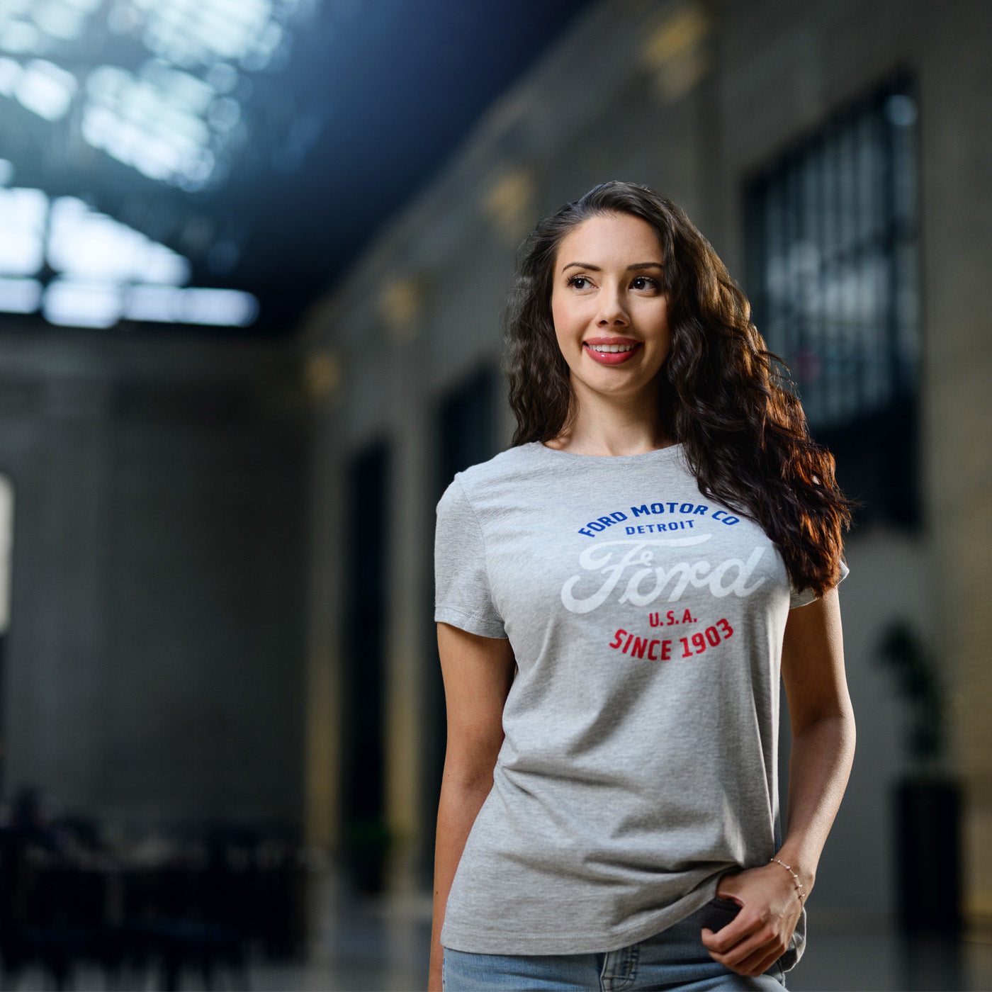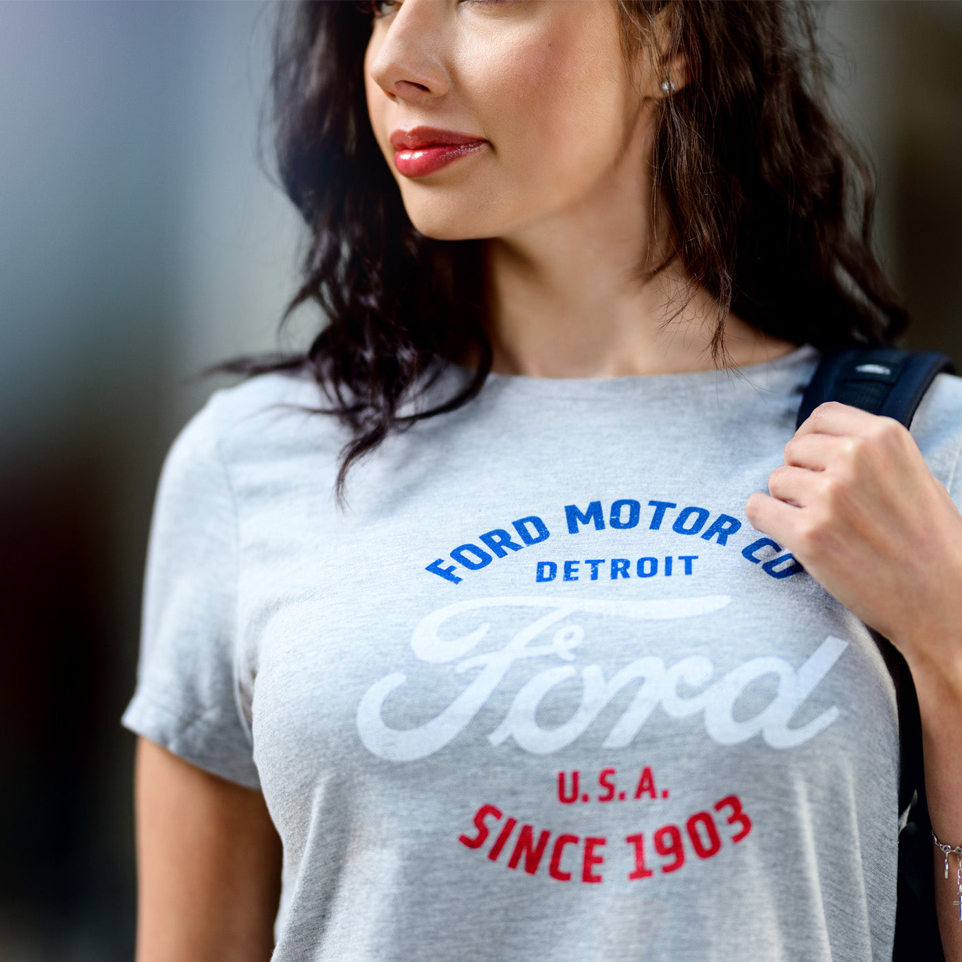 At Ford, we have never been afraid to show our true colors: red, white, and blue. Made in America and constructed of cotton-polyester blend, the Ford Motor Co. Red, White, and Blue T-Shirt is an emblem of our commitment to the values that have built both Ford trucks and America.