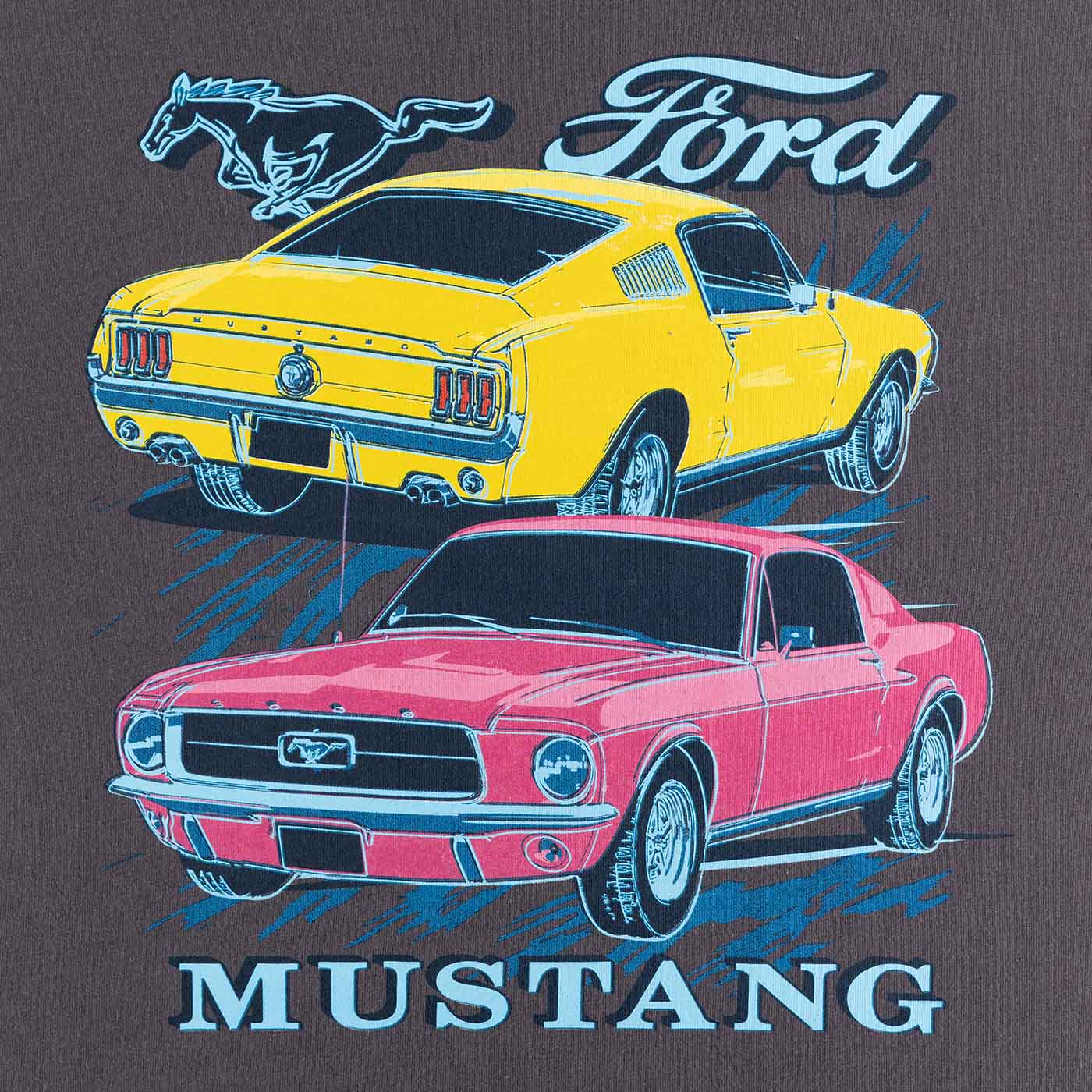 This Ford Mustang graphic tee features your favorite classic cars. This charcoal tee showcases vivid pink and yellow vintage Mustangs alongside sharp, blue-outlined Ford script, bold Mustang block letters, and the iconic pony logo. Crafted from 100% combed ring-spun cotton fine jersey, it features a sturdy crew neck, ribbed collar, shoulder-to-shoulder self-fabric back neck tape, and reinforced double-needle stitching on sleeves and hem with side seam construction for lasting wear. Dare to wear a Ford Mustang shirt that revives the spirit of a legendary era.