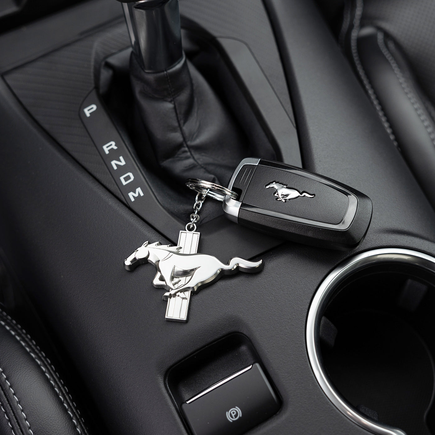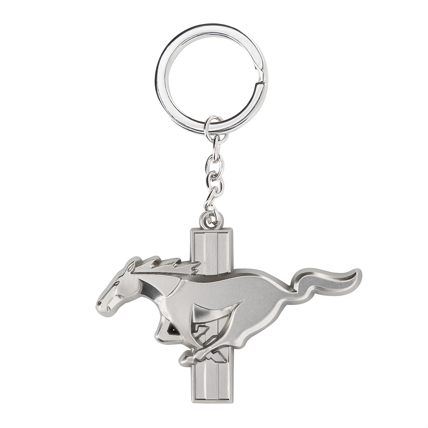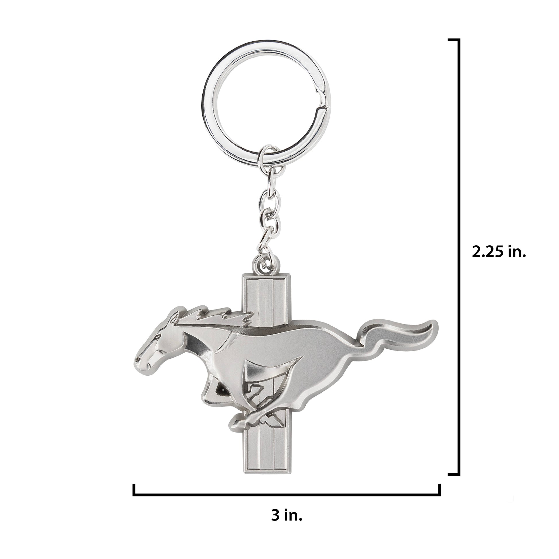 The Ford Mustang Pony Keychain was designed using vintage Mustang vehicle accents as inspiration. It has the Mustang racing to the finish line in the right direction. When you spin the keychain around the Mustang verbiage logo is down the backside. It is solid metal through and through and you will be impressed by the quality.