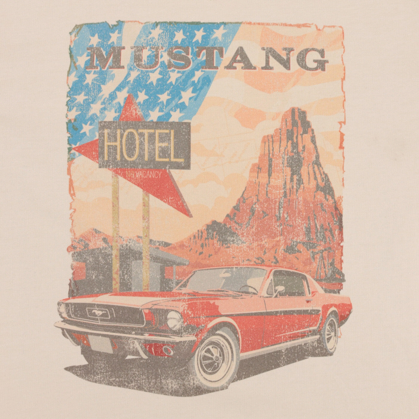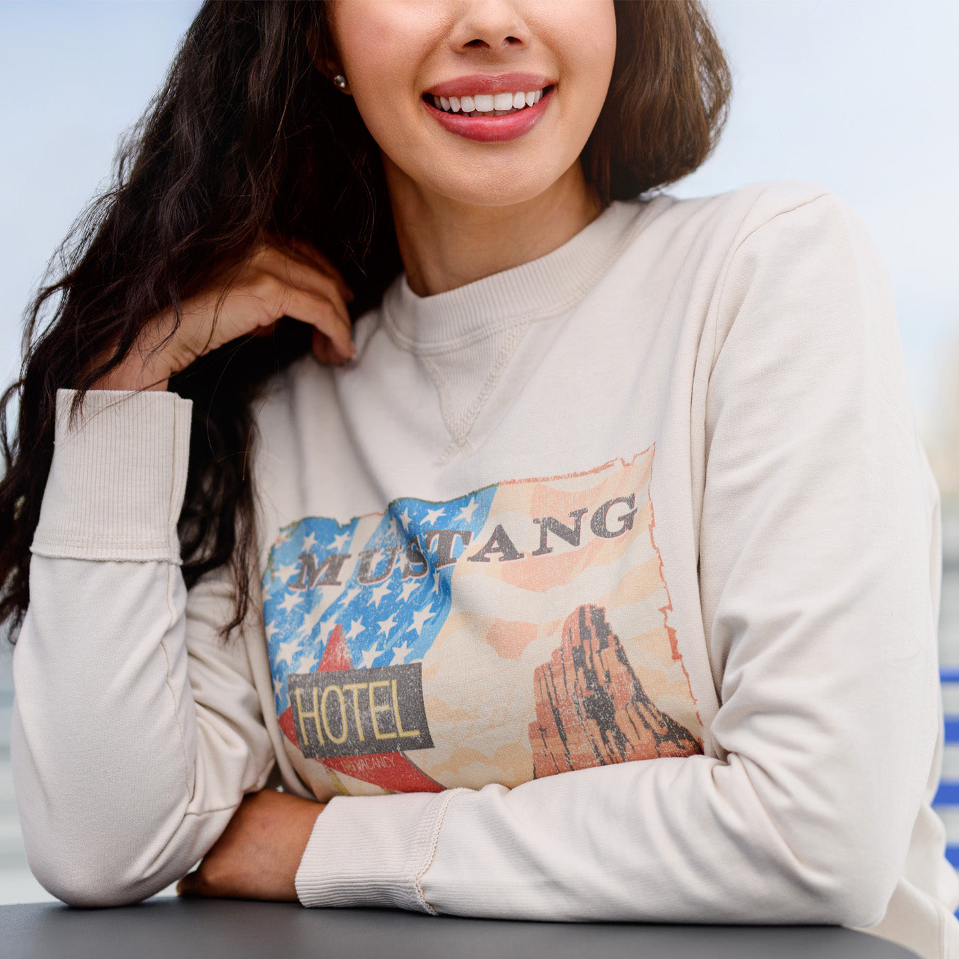 Just because a design was found in the past doesn't mean it has no place in the future. Designed for comfort. The women's Vintage Relaxed Pullover Sweatshirt showcases a bold Red Mustang graphic set against a retro hotel and desert backdrop; this cream-colored sweatshirt is made from lightweight fleece with recycled polyester.