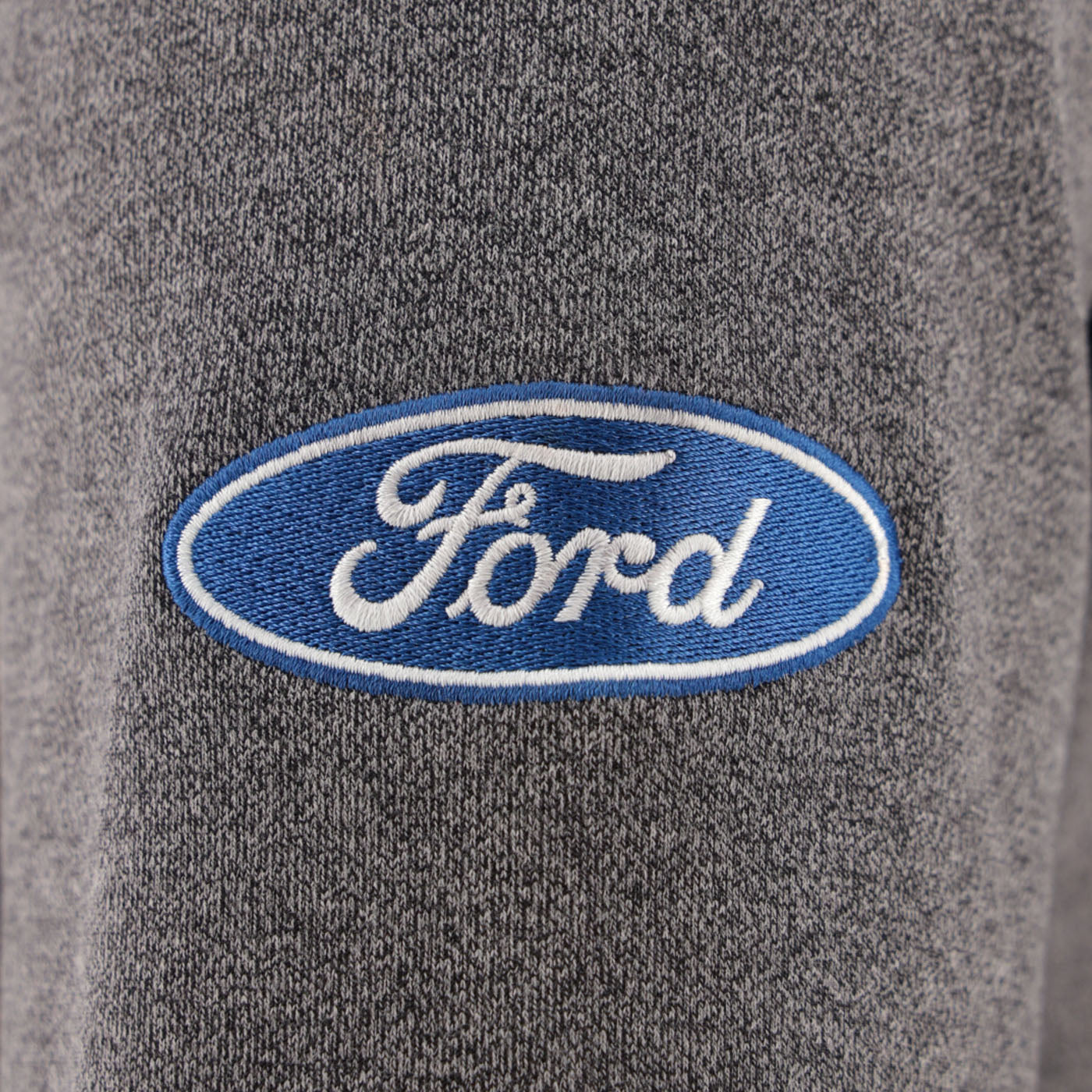 This garment is a structured fit and feels so comfortable on the inside and the outside. Along the seams you will see that we used panel seaming techniques with no top stitch for a smoother look. The garment is a grey body. Embroidered directly on the upper side of the left sleeve is the Ford script logo in blue and white thread. For ventilation just unzip the quarter zip. On the side pockets is matte black reflective and there is one on each side for stowing your items or keeping your hands warm. The collar is a Pegasus style with top stitching on the exterior. The interior collar is self-facing. Overall look will be well complemented and a nice addition to any wardrobe.
