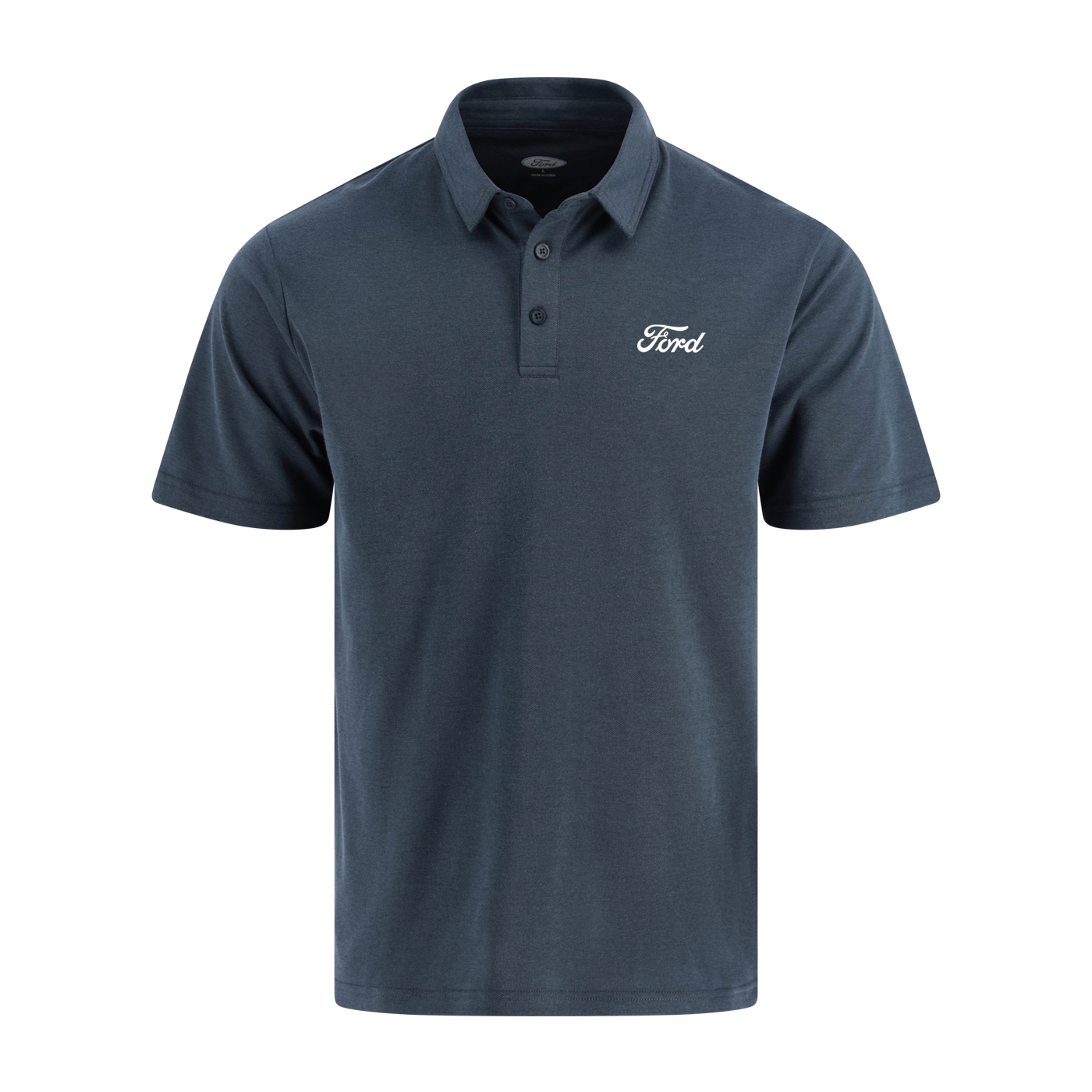The Men's Heather Blue Ford Polo Shirt displays the white Ford script on the upper left chest. It offers a classic fit with a self-fabric collar. The addition of a three-button placket ensures a spiffy final look. And a vented button hem for provides enhanced mobility. It also comes in a classic fit so you can tuck it in or leave it untucked comfortably. This polo is made from a 142 gsm fabric blend of 57% Pima cotton and 43% polyester pique knit, it ensures comfort and durability. For care, turn the Ford polo shirt for men inside out and wash cold with like colors on a gentle cycle. Use non-chlorine bleach if needed, tumble dry on low, and iron on low heat while avoiding the decoration. Dry cleaning is not recommended.