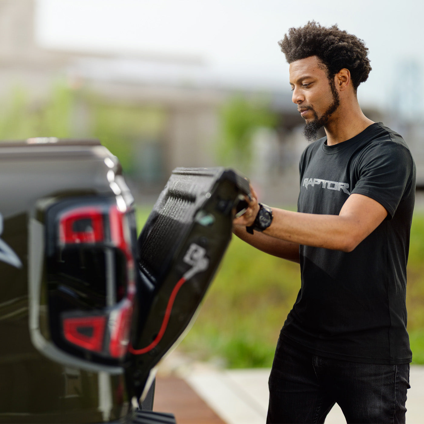 Get ready to tackle the day in the moisture management performance jersey black Ford Raptor Men's Black T-Shirt. This tee combines sun protection with a comfy fit, perfect for those who like to work hard and roar louder in true Raptor style. This shirt fabric has a UPF (ultraviolet protection factor) of 50 plus. This men's shirt is made from 95% polyester and 5% spandex jersey fabric. It's outfitted with a shiny reflective Raptor logo to keep things as slick as the track. For comfort, this shirt has a tear-away label. To care for this men's t shirt, be sure to turn it inside out and wash before wearing. Ensure you wash on a cold, gentle cycle, with like colors. To dry put on low and tumble. To maintain the logo's quality, do not iron, dry clean, or bleach decoration. Get in gear!