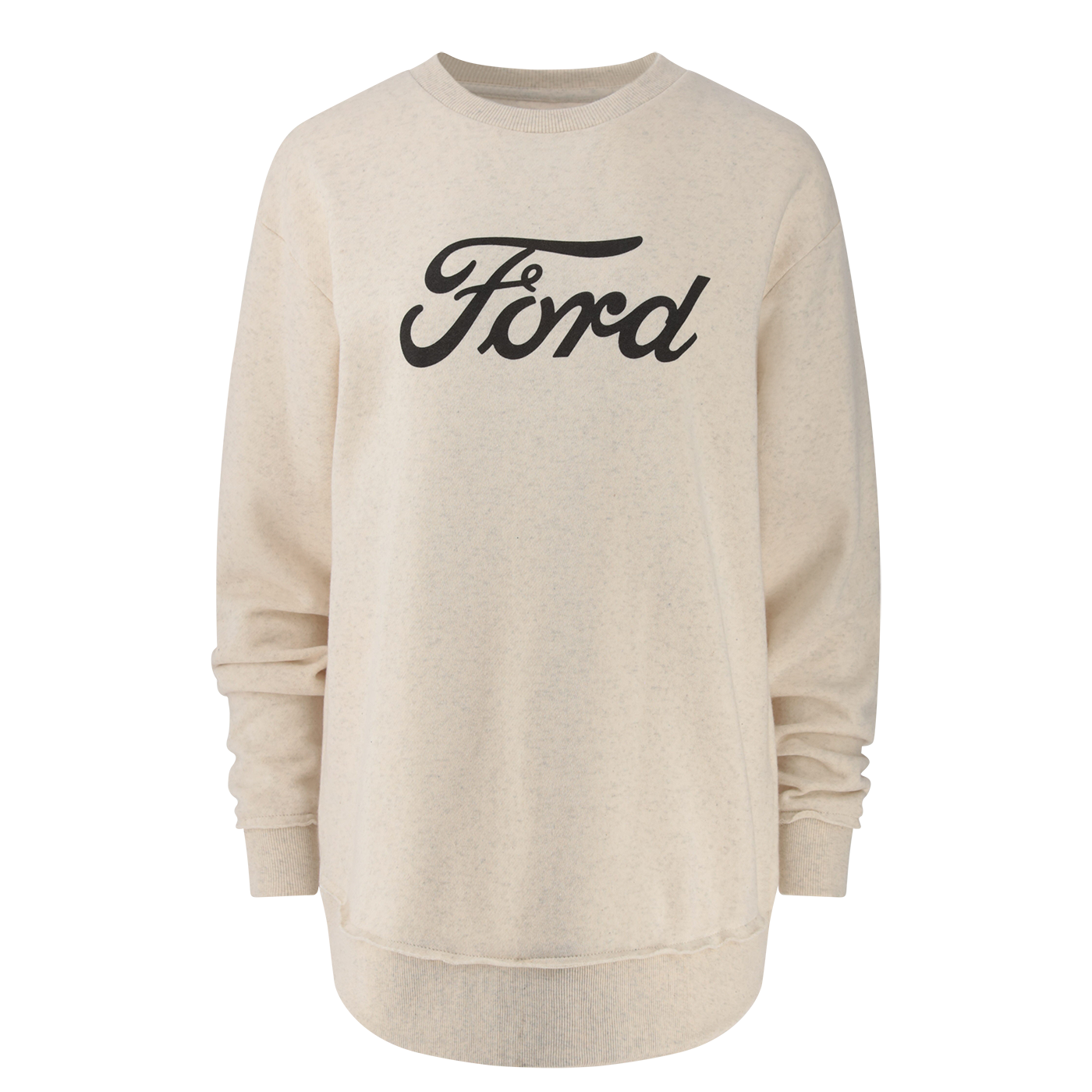 This playful women's pullover sweatshirt boasts a cozy ribbed collar and soft jersey back neck tape. Made from a comfy mix of 60% ring-spun cotton and 40% polyester, it features a relaxed drop shoulder fit. The ribbed cuffs and bottom band come with fun raw edge seams, while the longer silhouette with a curved drop tail hem adds a flirty twist. With side seam construction and official Ford branding, this imported sweatshirt is ready to bring some spirited style to your wardrobe.