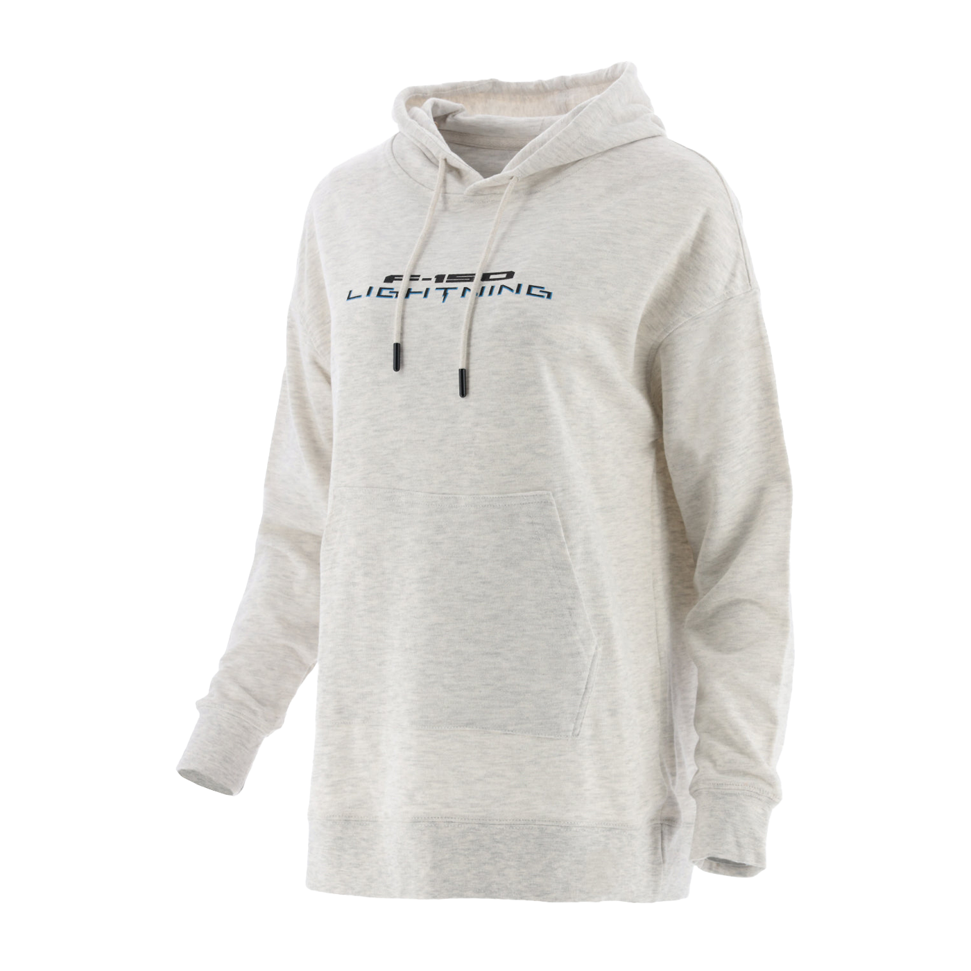 This long heather grey, hooded, long-sleeve women's pullover provides style, comfort, and warmth. The embroidered F-150 Lightning logo on the center chest is accompanied by a front pouch pocket and drawstring closure, making it an ideal additional layer when temperatures dip.
