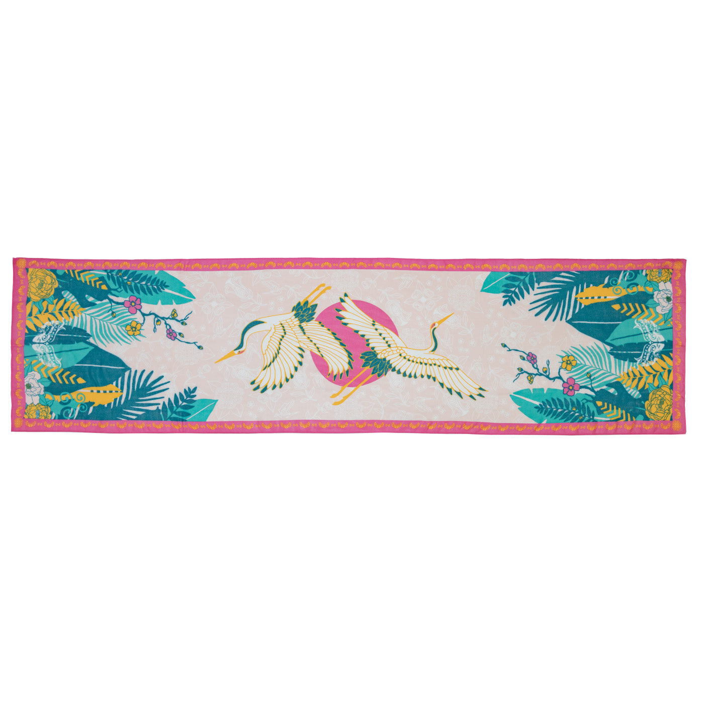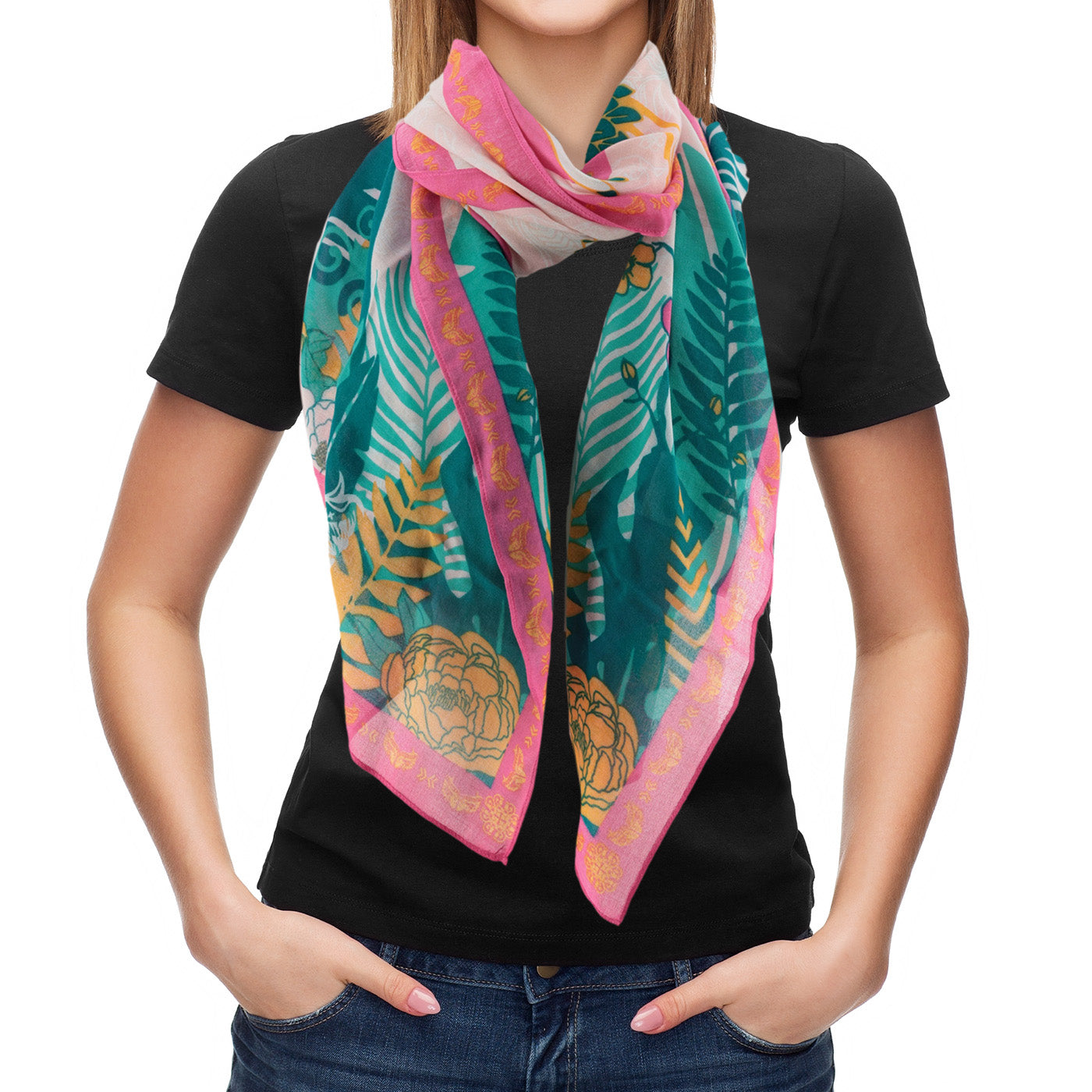 The scarf is 100% viscose fabric. You will see it has a custom botanical in a floral paisley pattern with pink, blue, white, yellow, and orange colors. There are two cranes in flight on the scarf. The Crane Warrior Symbol represents hope for recovery, health, and happiness.