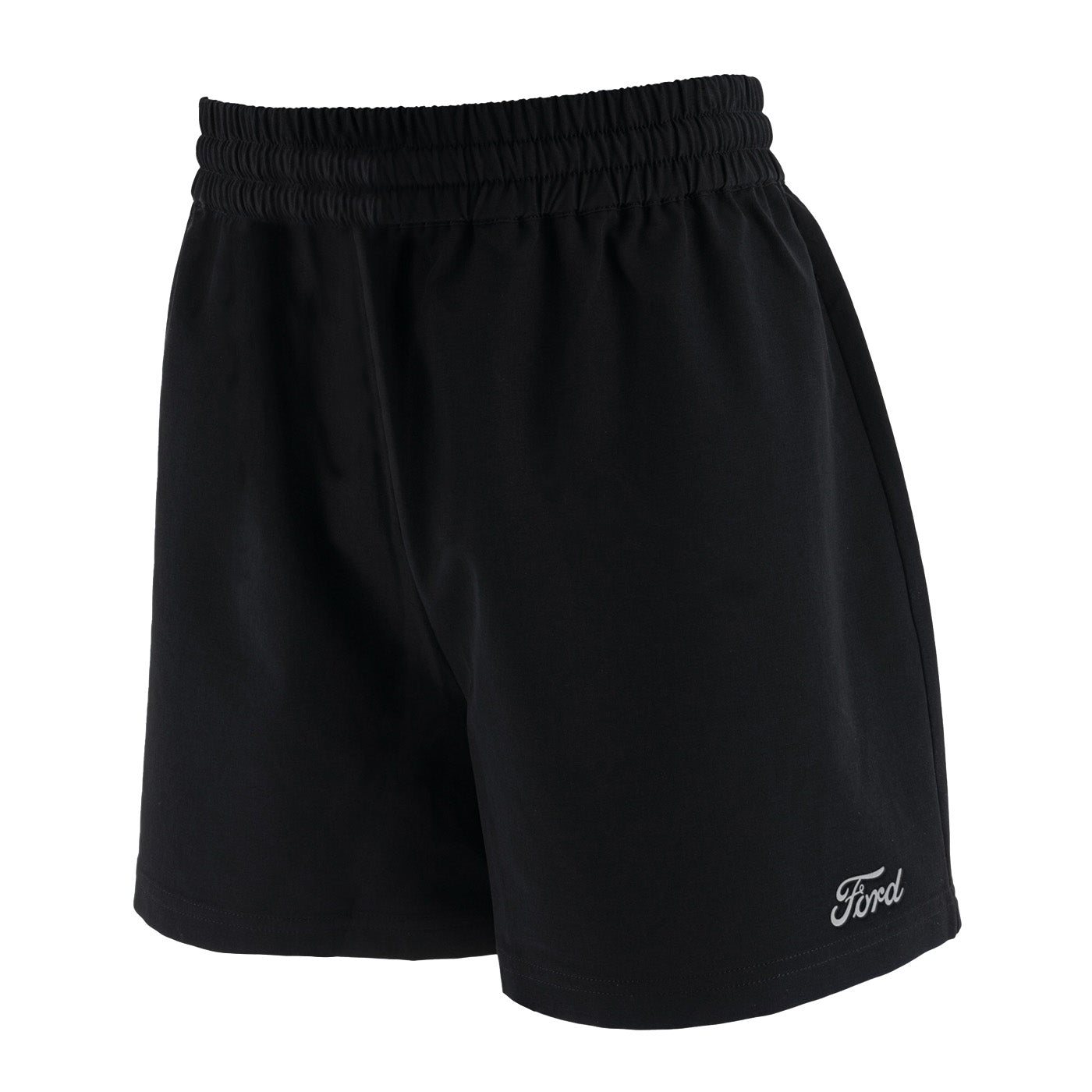 These are a mid-thigh and casual relaxed fit. Drawstring cording mixed with elasticity for a snug or relaxed waistline. These shorts are made out of 8 percent spandex and 92 percent polyester material. The shorts are black, with a Ford scripted logo in reflective silver by the hemline. The drawstrings are black and on the inside waistline