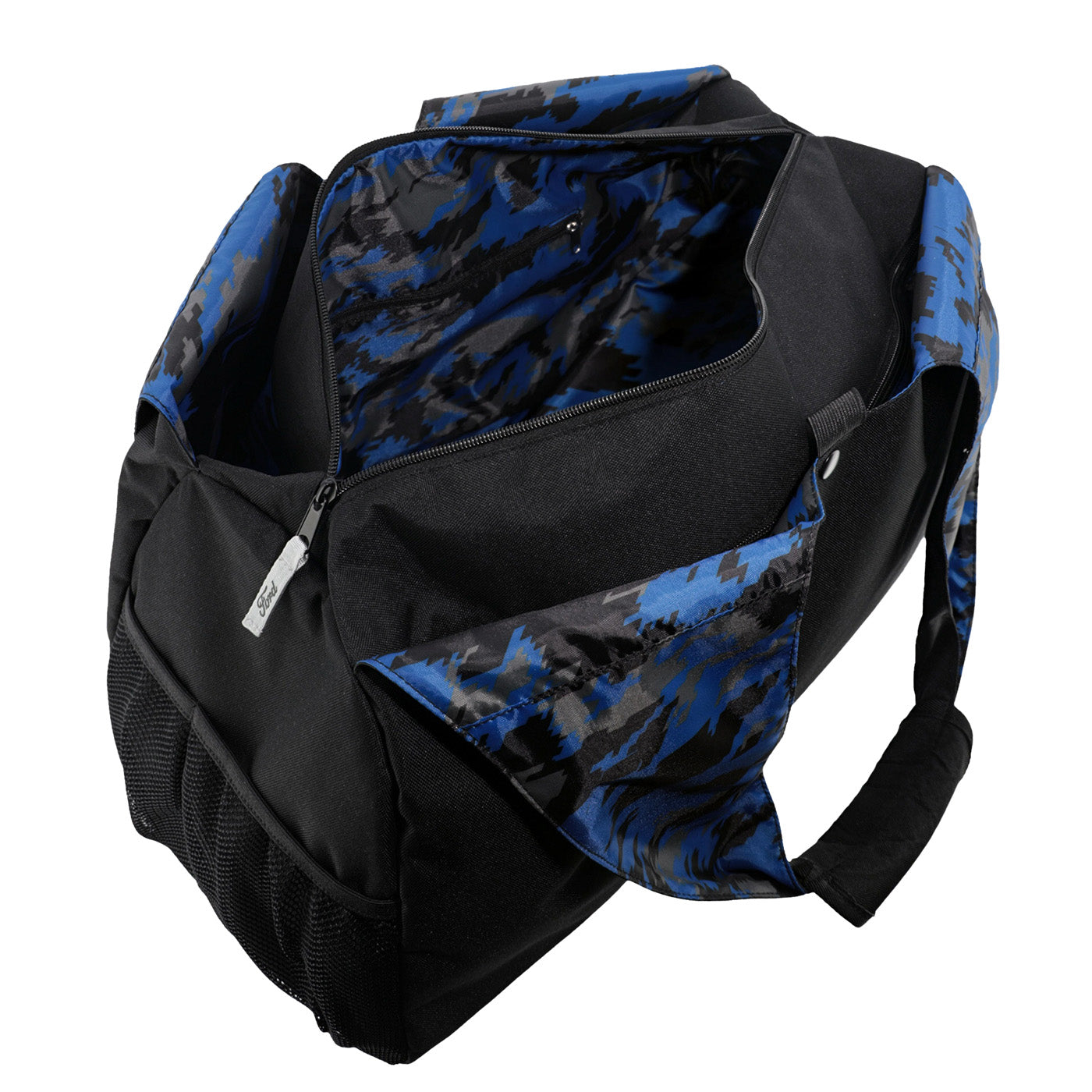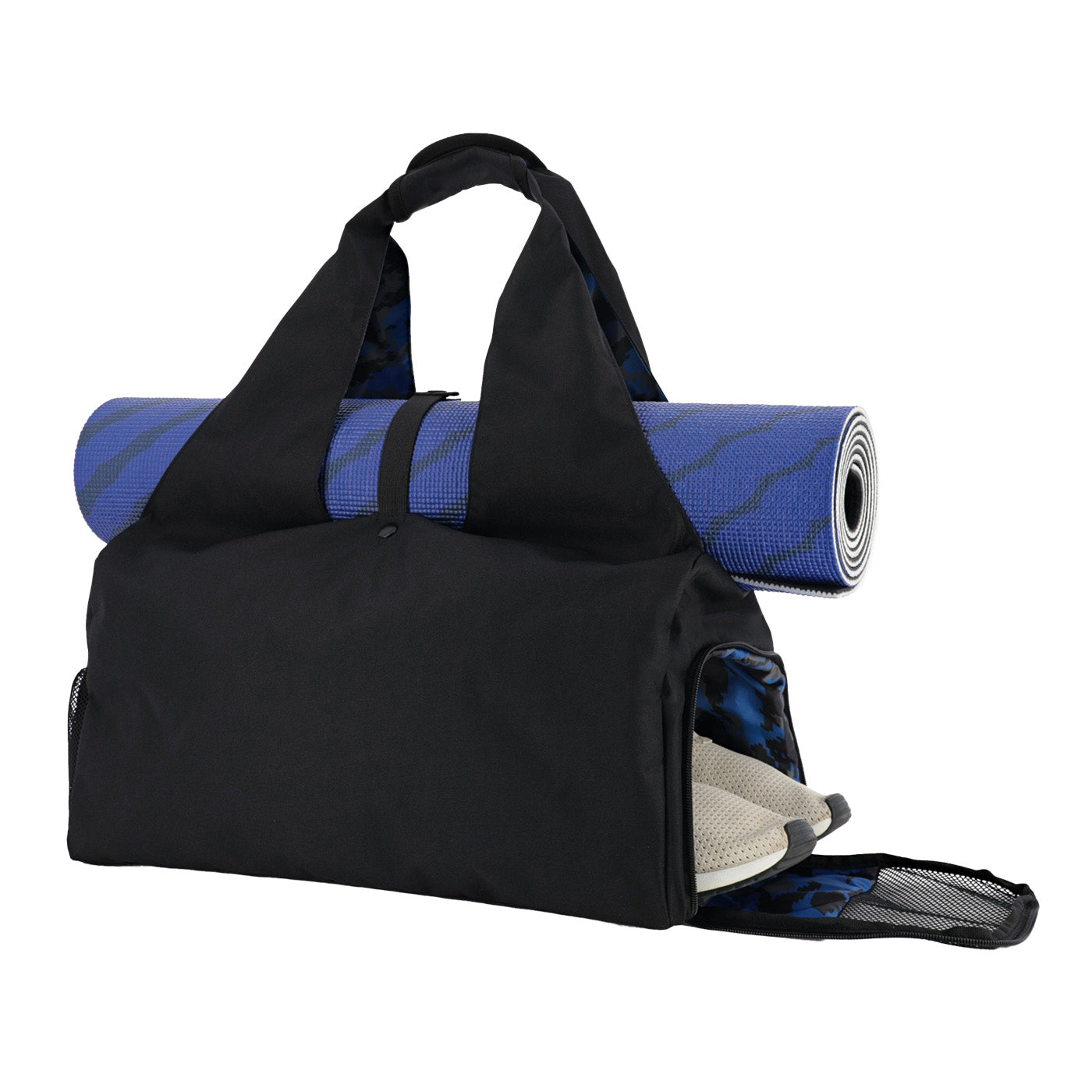 The tote has a wide handle that will house a yoga mat and give you plenty of room carry it to your workout session. Hook & eye closure helps keep the handles together. An interior button strap keeps the yoga mat secured. Pocket to stow a water bottle and mesh pocket for storing shoes. A Clear interior pocket and large interior pocket. Lined with Blue Camouflage fabric.