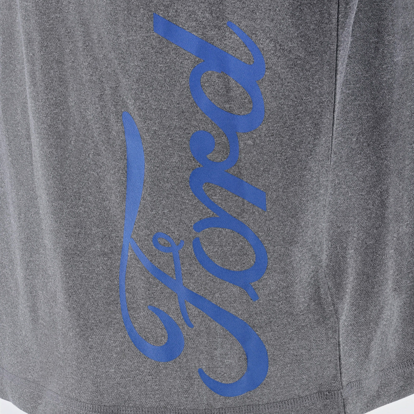 It has a ribbed collar and cuffs for structure. The base color of the shirt is a heather grey and has a Ford scripted logo in blue vertically on the left side of the shirt. Tag-less neck label for extra comfort and a relaxed fit for ease of movement.